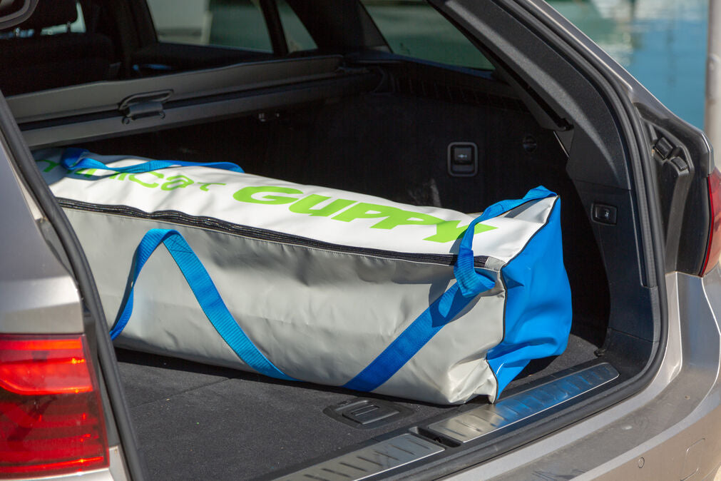 The beauty of owning GUPPY is that you don't need a trailer to transport it. This fantastic portable sailing catamaran is stored in a single bag that fit perfectly in any personal car or a van.