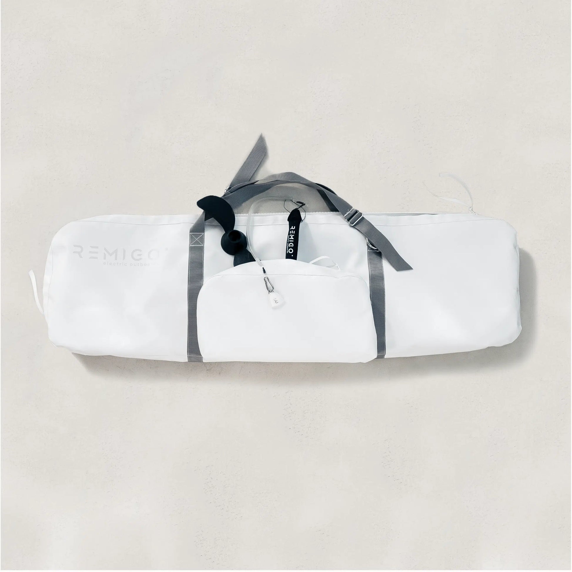 The carry bag includes an outer pocket for your transom bracket and charger(s), plus an inner pocket for small items like the RemigoOne Key and tools. To keep your outboard secure during any transport, simply fasten it using the two internal straps. Extra padding in the corners protects the propeller and interface from damage.